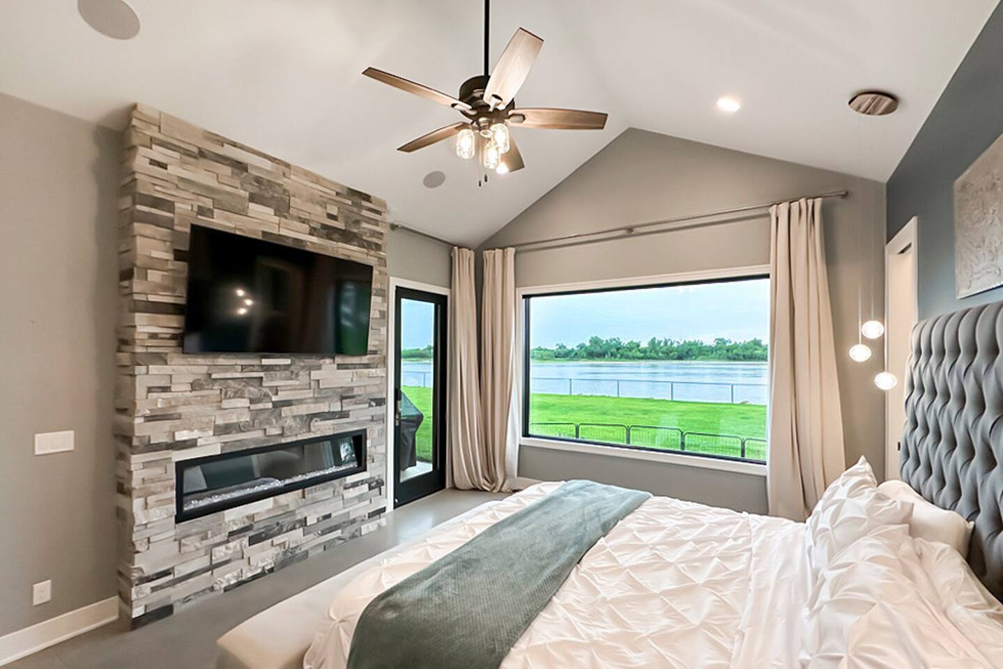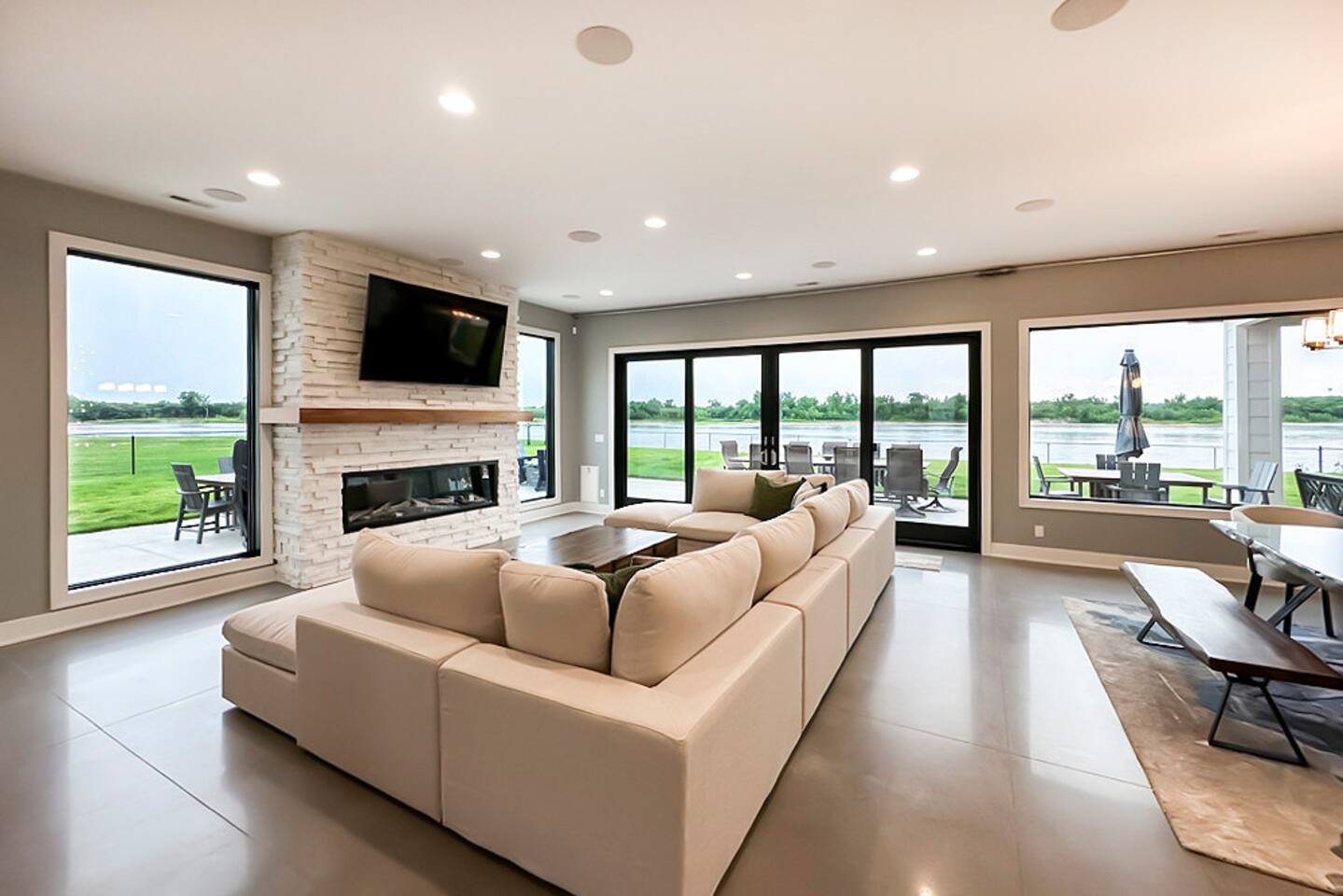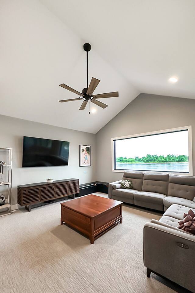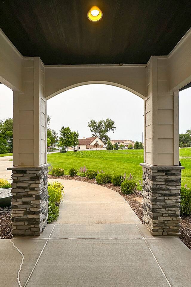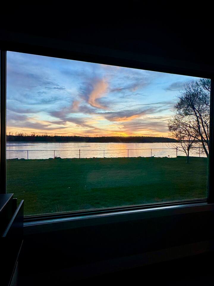 This is our personal Riverfront home with a total of 5 bedrooms, 4 bathrooms, 3000+ sqft, sleeps 10 in true beds & incredible views! Big bonus, the primary suite is on the main floor along with 2 more bedrooms. Family room, 2 more bedrooms, & bathroom upstairs. 10 guests maximum on property. Important to Note: You do NOT have access to the river for safety purposes. Also, since this our personal home the drawers & closets will have our clothes but plenty of hanging space for your clothes. Help yourself to any food in the pantry or refrigerator. I provide lots of disposable plates, cups, utensils & napkins. Open floor plan with kitchen, dining, & living room is one shared space. The living room features an electric fireplace (currently not working) and a large sectional. The large patio off the living room has multiple seating areas, a gas grill (one propane tank provided), fire pit (firewood provided) & a TV. The bedrooms feature an Alexa device (to play ambient noises at night to help you sleep & set alarms) For the ultimate sleep, each bedroom also has bamboo sheets, a fan, & blackout window shades. The main floor primary suite has many helpful features including wide doorways & an adjustable king bed controlled by a remote. The ensuite bathroom has double vanities and a shower so large it also has a tub inside of it. Owner will leave you plenty of space in the walk-in closet to hang your clothes. This home is off the interstate & only 20 minutes to downtown Omaha which includes the Old Market, CHI Center, and College World Series events. Other attractions nearby are the Henry Doorly Zoo (18mins), Werner Park (20 mins), & Eppley Airfield (25mins). - Kitchen: features walk-in pantry, oven with an electric cooktop, microwave, Keurig, blender, toaster, & more. -2nd Bedroom (girl’s room): 1 queen bed & 1 vanity with access to shared bathroom. - 3rd Bedroom (boy’s room): 1 queen bed & 1 vanity with access to shared bathroom. - 2nd Bathroom: access between bedroom 2 & 3. Share a tub/ shower combo & toilet. - 3rd Bathroom: 1 vanity/ sink, shower, and toilet. Second Level: - Family room with sectional, smart TV & gorgeous views of the river. -3rd Bedroom: 1 king bed, smart TV, closet. -4th Bedroom (Non-conforming, No built in closet open one provided). Queen bed, smart tv, & a desk. - 4th Bathroom: 1 vanity, shower, & toilet. Parking: no more than 6 cars allowed. Guests do NOT have access to inside garages. No parking along the side of the street, narrow roads in the neighborhood. Security System throughout home with multiple security cameras outside only, for insurance and safety purposes, NOT for guest use.